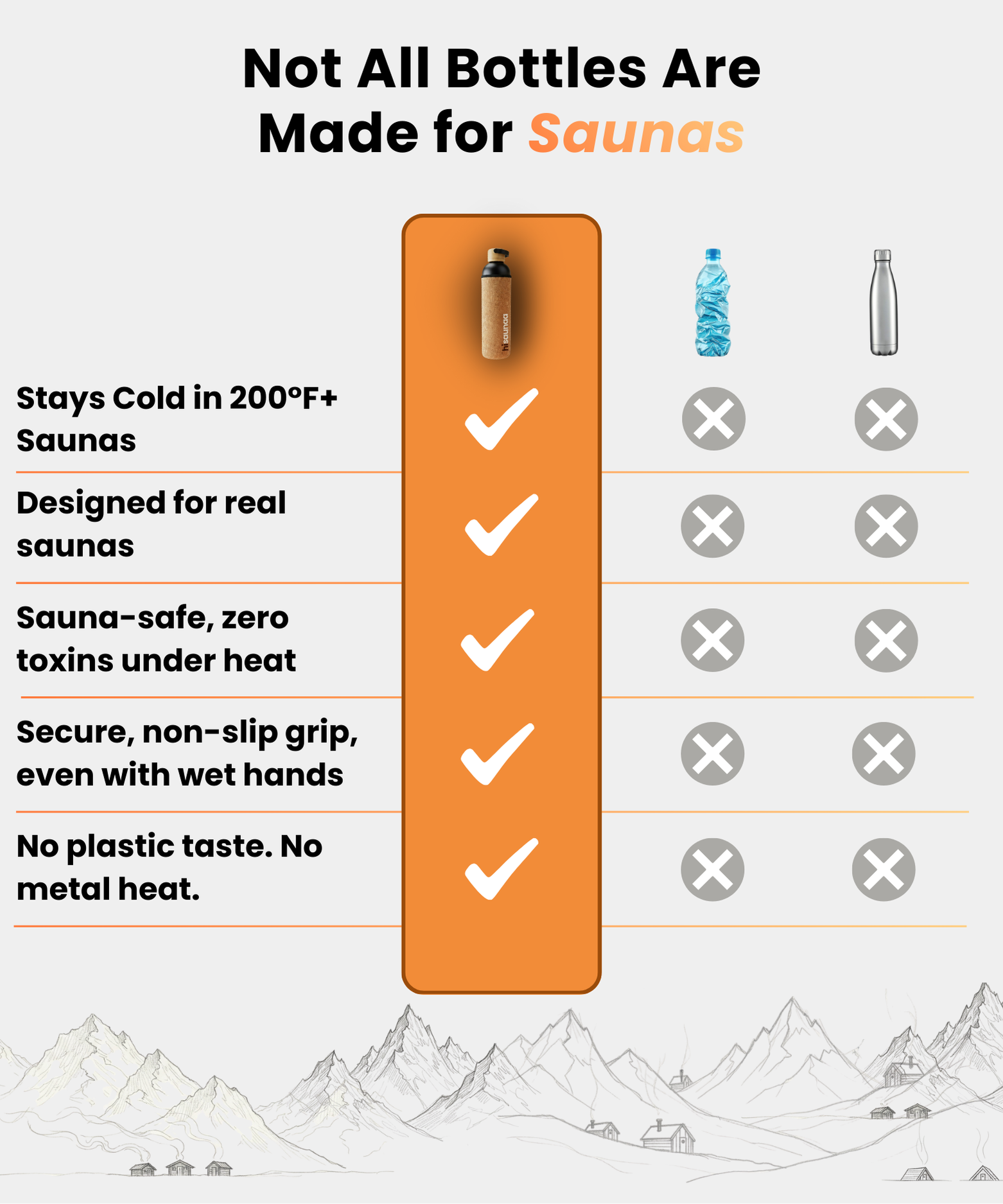 The bottle keeps water ice-cold for 12+ hours — even in high sauna temperatures.